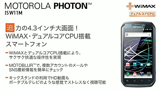 そんなあうさんから新たに発売されたのが、予想通り「Motorola Photon 4G」をベースとした端末、「MOTOROLA PHOTON ISW11M」。