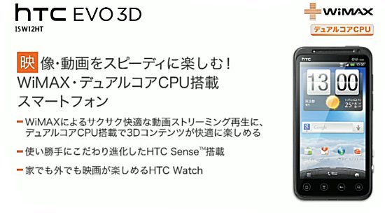 さらには、コレまた予想通り、「HTC EVO 3D」としてグローバル販売されている端末「HTC EVO 3D ISW12HT」。